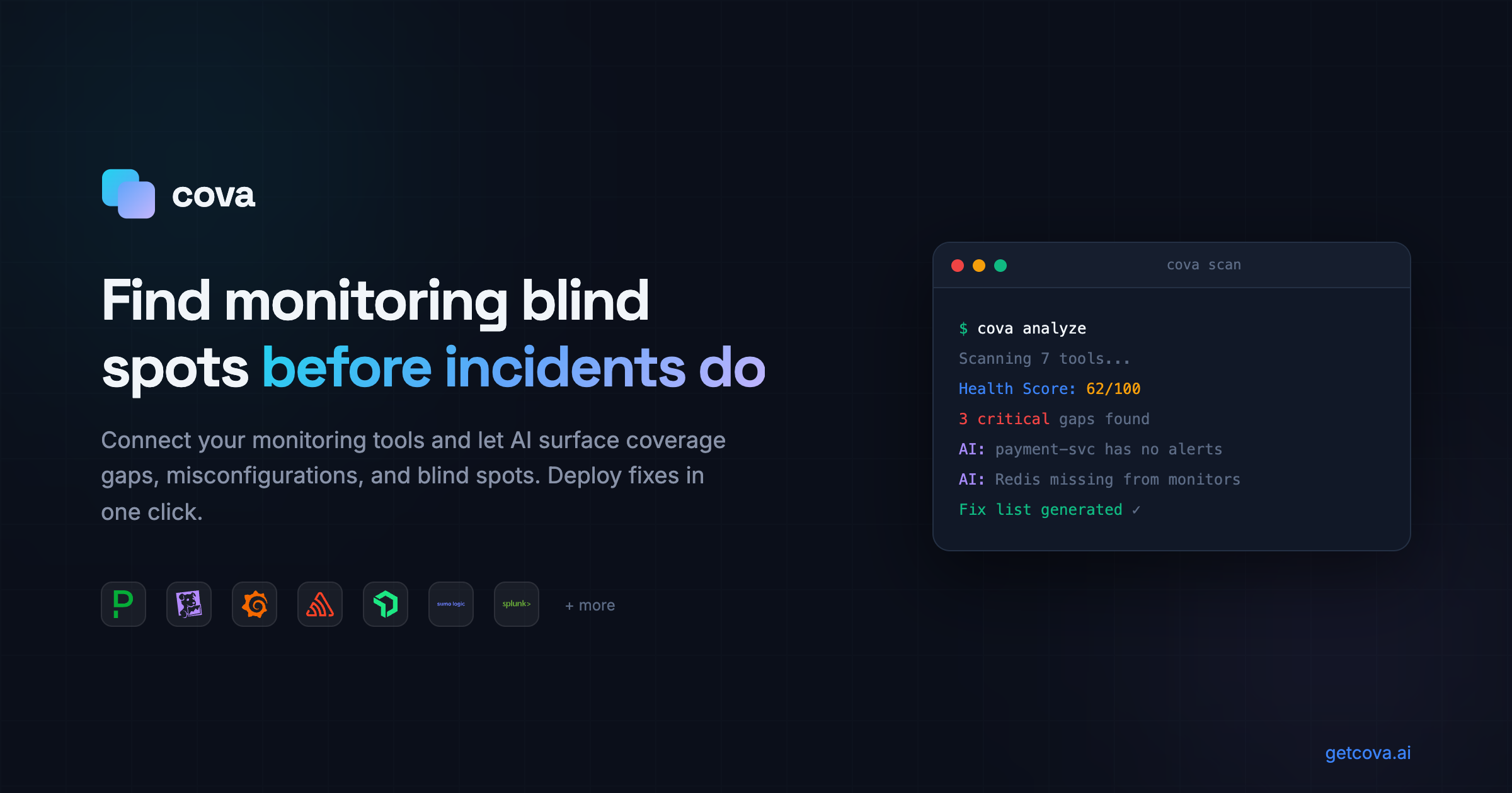 Audit your monitoring stack for coverage gaps and blind spots. Cova connects to your existing DevOps tools and uses AI to surface misconfigurations, missing coverage, and alert fatigue - then deploys fixes in one click.